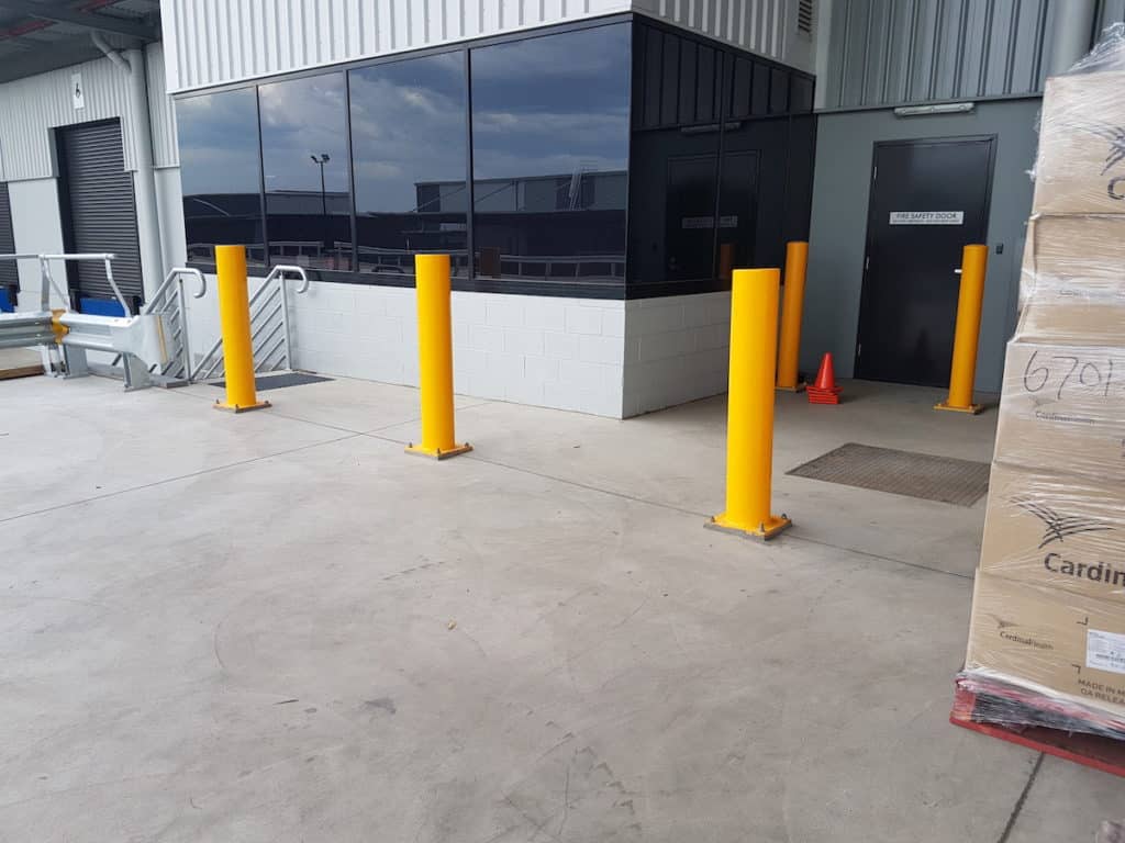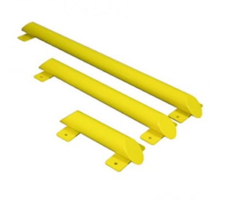 Elementos de protección metálica para delimitar zonas y prevenir impactos en áreas de tránsito industrial.