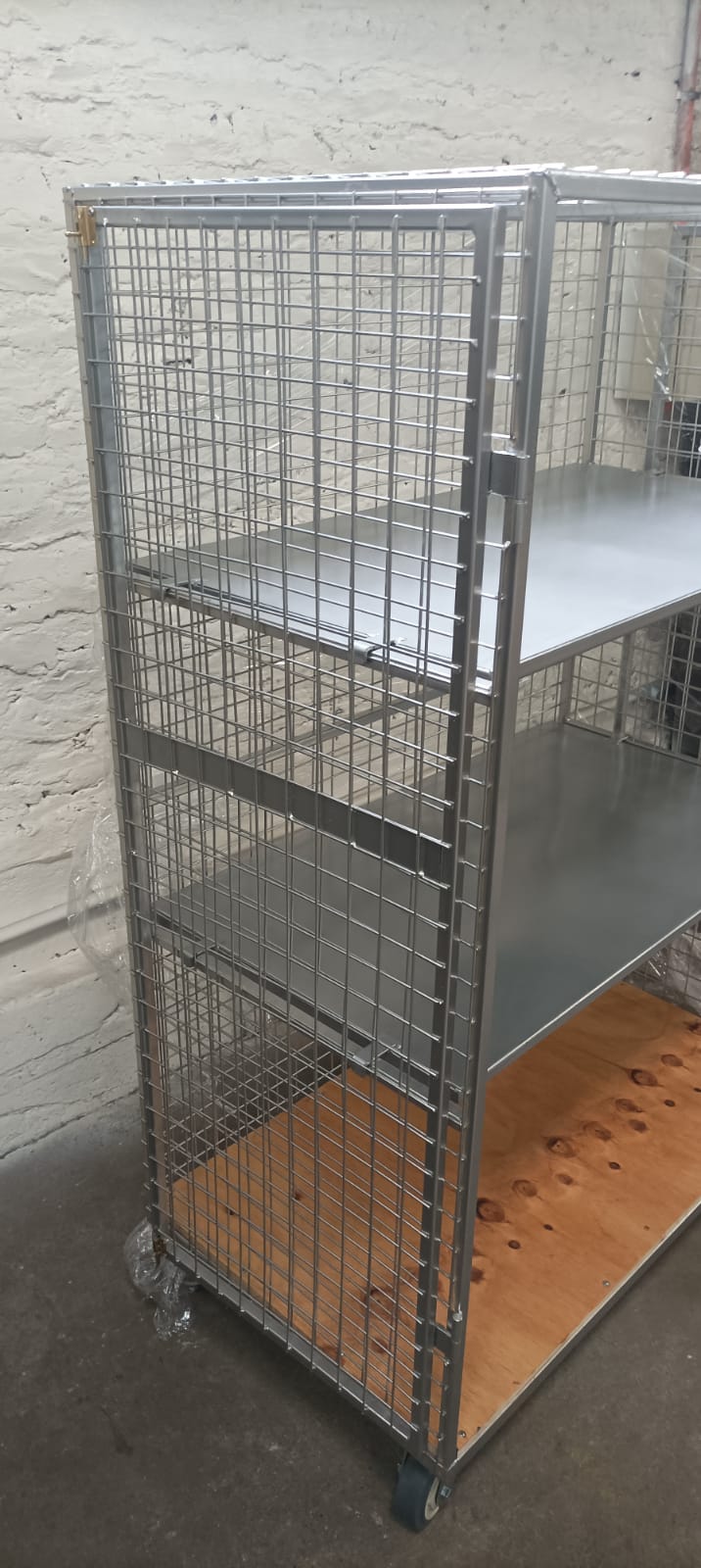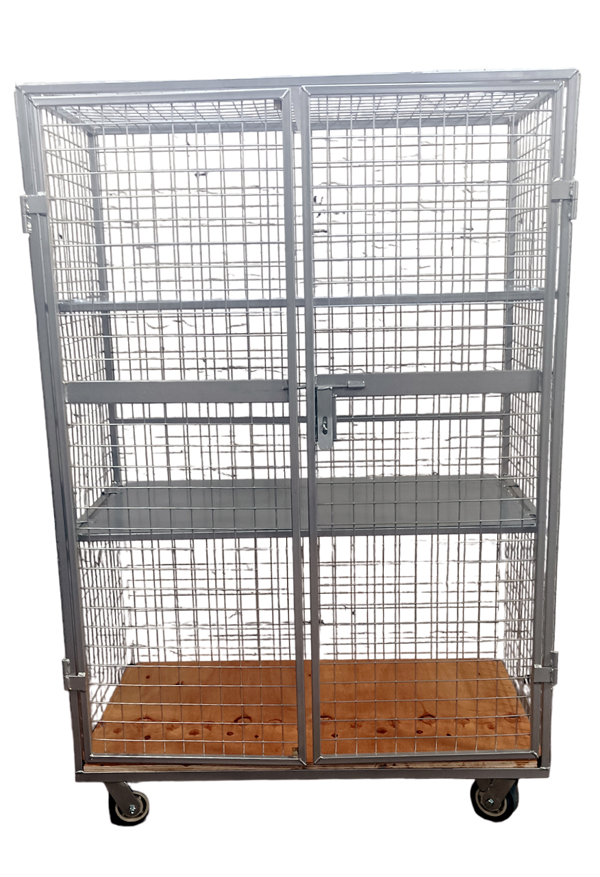Roll Container Jaula fabricado en acero, fondo, laterales y puerta en malla 50/50 bandejas mdf 15mm/acero – estructura perfil 20x20x1.5 – Ruedas 5x2HD – 2 fijas y 2 giratorias. Pintura Electrostática.
